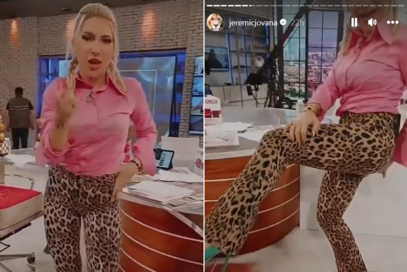 Jovana Jeremić je na svom Instagram storiju objavila seriju skrinšotova iz emisije na kojima se vidi trenutak kada se masira, ali i šta je radila tokom pauze. Utegnuta u uske pantalone, Jovana je zaigrala i zapevala, a uz taktove pesme rešila i da se par puta pljesne po butinama i zadnjici.