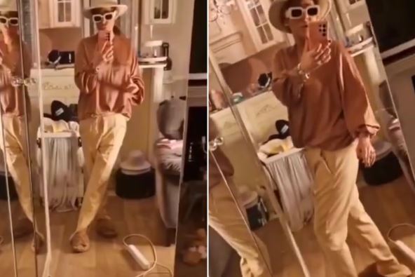Sada je Ana Nikolić objavila snimak iz svog doma, na kojem je vidimo dok se ogleda u ogledalu obučena u bež pantalone i svilenu bluzu. Na glavi nosi šešir, naočare na očima, a Ana sve vreme, osim odevne kombinacije, snima i papuče koje nosi.