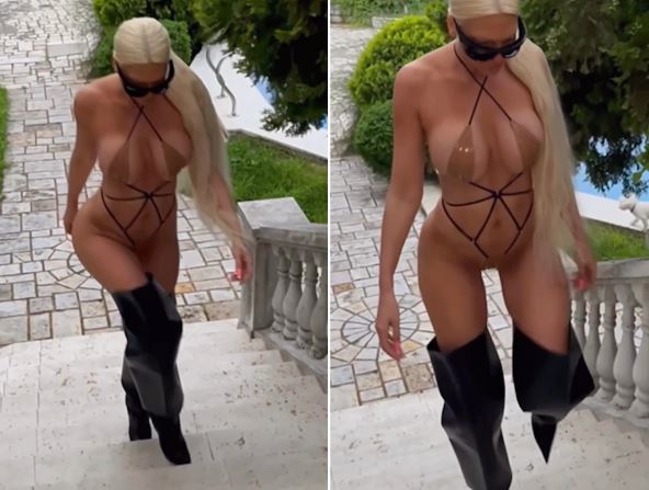 Jelena je na Instagramu objavila video kako se "opušteno šeta po imanju", obučena u minijaturni kupaći, koji čine par PVC tračica i konopac, ali i duboke čizme koje dosežu do butina.