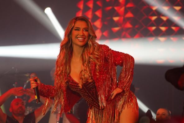 Pevačica je nastupila u crvenom miniću sa resama i šljokicama ispod kojeg je nosila šorts, pokazala dekolte i duge noge. Pogledajte kako je izgledala: