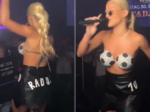 Pevačica koja je ranije pred publiku izlazila u tanga gaćicama, sada je rešila da pokrije zadnjicu suknjom na kojoj je pisalo njeno prezime "Radujko", dok je grudi prekrila fudbalskim lopticama.