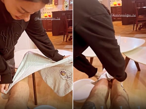 Kaća Lazić Darku pere noge u lavoru Izvor: instagram/darkolazicofficial