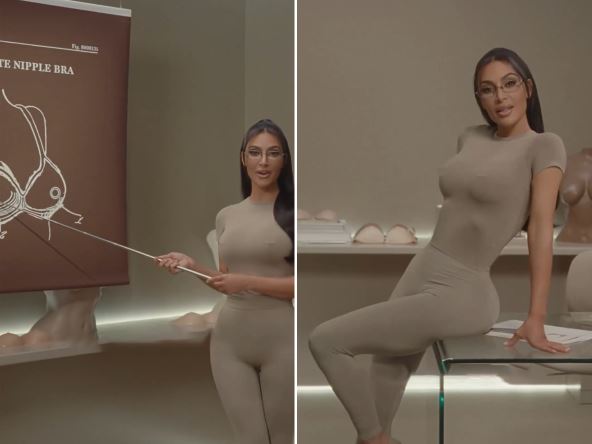 Kim se pojavljuje kao "naučnik" dok sedi za kompjuterom, a zatim i stoji ispred table sa štapom za prezentaciju. Obučena je u helanke i top krem boje iz svoje "Skims" kolekcije, a ono što je u prvom planu su njene naglašene bradavice!
