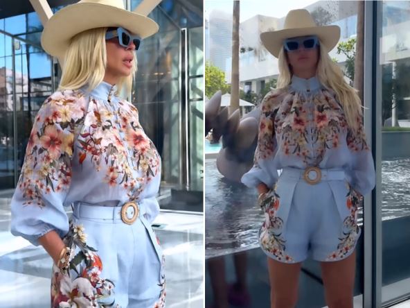 Jelena se snimila zakopčana do grla, u kombinezonu brenda "zimerman", čija se cena kreće i do 900 evra, dok je na glavi nosila bež šešir.