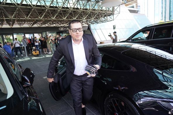 U pitanju je skupoceni model marke "porše". Pejović je izašao i pozdravio okupljene fotoreportere i novinare, a potom ušao u salu gde ga je već čekala supruga, koja nije krila koliko je ponosna na muža.