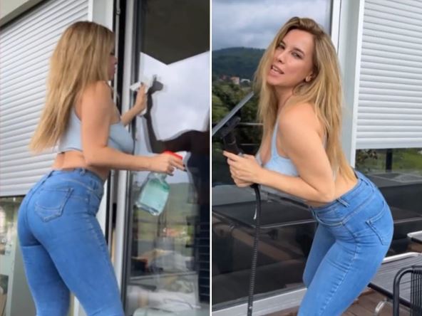 Hrvatska pevačica i buduća voditeljka ispijala je kafu pozirajući samo u peškiriću, da bi sada pokazala i kako čisti prozore. Utegla se u uske farmerke i top majicu, pa počela da čisti i uvija se pred kamerom.