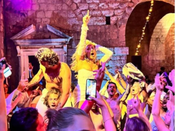 Tako se mladoženja mogao videti bez košulje kako viče i peva dok sedi prijateljima na ramenima, a uskoro mu se pridružila i mlada koja je venčanicu zamenila kraćom haljinom te opušteno plesala s okupljenim zvanicima.