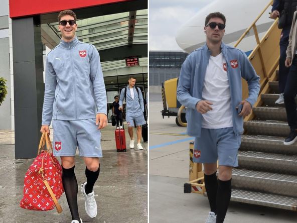 Naš reprezentativac Dušan Vlahović je juče sa našim timom otputovao u Beč, gde ih večeras očekuje prijateljski meč sa Austrijom. Tom prilikom Vlahović je poneo i neobičan stajling, u kome su dominirale crne najlon čarape i crvena torba "Luj Viton", čija je cena tričavih 10.000 evra i jedna je od najskupljih u ponudi prestižnog francuskog brenda.