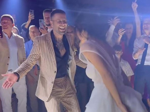 Mladoženja je za ovaj svečani dan odabrao odelo na pruge, dok je sve vreme nosio naočare, a njegova partnerka je blistala u venčanici. Par je sve vreme igrao i uživao, a mladenci nisu skidali osmehe sa lica.