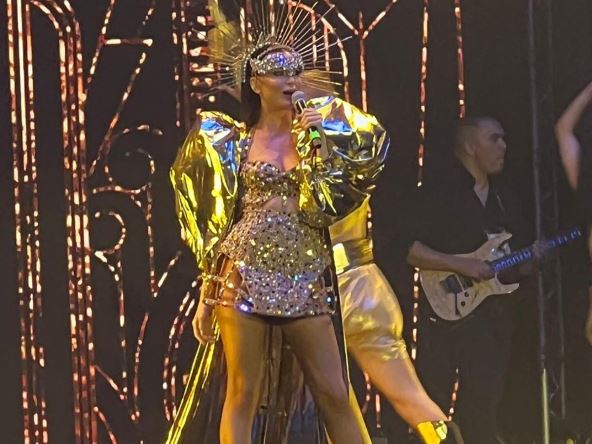 Na plus 40 izašla je na binu u zlatnom miniću, a potom se presvukla u triko koji je bio optočen sa 100.000 svarovski kristala.
