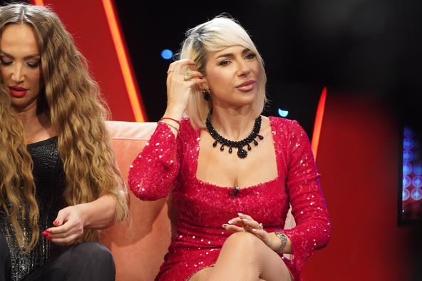 Obučena u zlatni minić i bluzu s golim leđima i dekolteom do pupka, Jovana je, naslonjena na merdevine pričala pratiocima o slici koja krasi njen dnevni boravak i izmamila i komentare o brusu koji nije nosila...