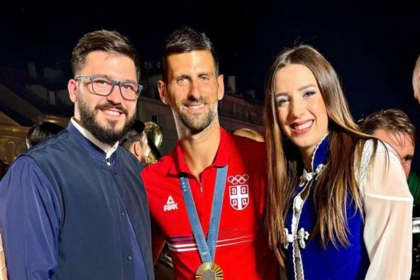 Najbolji teniser sveta slavio je omlimpijsko zlato uz njenu pesmu "Veseli se srpski rode", koju je Danica sinoć izvela i pred okupljenim građanima. Ipak, veliku pažnju je izazvao i Daničin suprug Ivan Crnogorčević, koji je inače i tvorac popularne pesme. On se srdačno pozdravio i izgrlio sa Đokovićem, a potom su na društvenim mrežama objavili i zajedničku sliku.