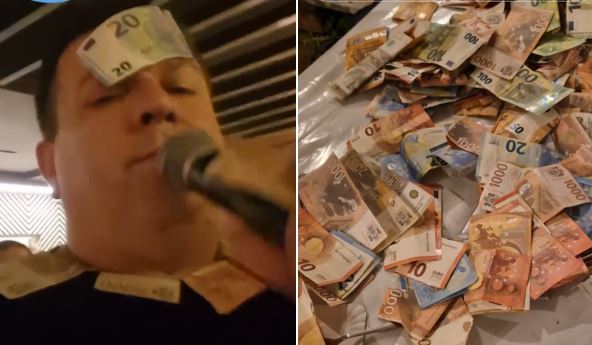 Erović je na društvenoj mreži Tiktok objavio par snimaka, prvo na kojima se vidi kako ga gosti na nastupi kite parama oko kragne majice, a potom i čelu, a potom i kako izgledaju te pare "na gomili", kada ih je sve stavio na sto.