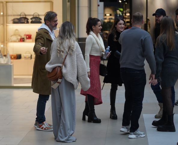 Ona se pojavila u prilično ležernom izdanju - pantalonama, patikama i teddy kaputu, bez šminke, a u jednom trenutku je čak i sela na pod dok je Sergej sa kolegama davao izjave.