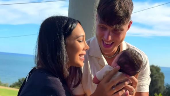 Na fotografijama se vidi kako novopečena mama pozira sa bebom u naručju, dok im na jednoj od fotografija društvo pravi i tata Tajo. Lice deteta je pokrila emotikonom u obliku srca, a na drugoj fotografiji su ruke oba roditelja oko malih prstića bebe.