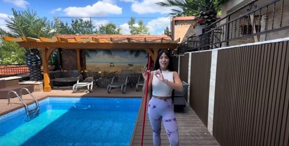 Ona se pobrinula da u kući ima nekoliko velikih trpezarijskih stolova, a boravak krase posebno izrađene garniture. Veliko dvorište je ukrašeno palmama, a ulaz u vilu je sav u zelenilu. U dvorištu bazen, košarkaški teren i park za decu. Pogledajte: