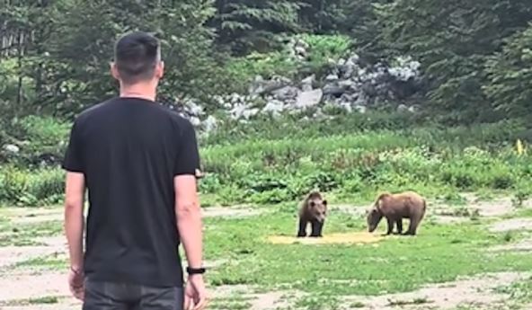 " Zar ovo nije nešto prelepo, na Šar Planini sam pored dva medveda koji se hrane i gledamo ih i uživamo", rekao je Vasić dok se u kadru iza njega vide mladunci medveda koji su mirno stajali i hranili se.