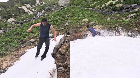 Vidno raspoložen, u majici bez rukava usred juna, Milan se snimao na obroncima planine gde je bio sneg.
