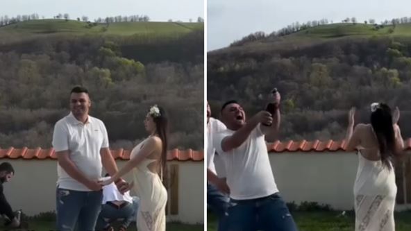 Na slikama se vidi da je mlada nosila kratku belu haljinu, dok je mladoženja bio u košulji. U rukama je držala bidermajer.