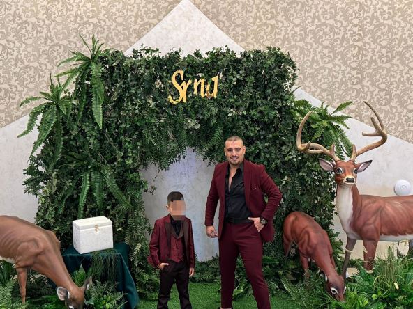 Darko i Katarina nisu štedeli na dekoraciji. Darko je pozirao u bordo odelu i crnoj košulji sa sinom, dok se njegova majka odlučila za elegrantnu haljinu na pruge.