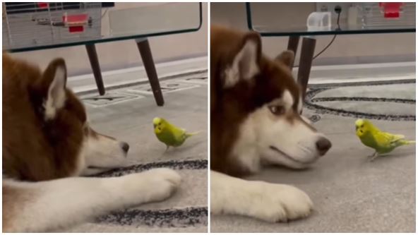 U snimku koji je za svega nekoliko sati pregledan više od 700.000 puta, vidi se simpatična i pomalo komična scena: papagaj Goša odlučno korača ka haskiju, dok se Dizel iznenađeno povlači unazad, čak ga i "čika", ne znajući šta da očekuje od malog, pernatog prijatelja.