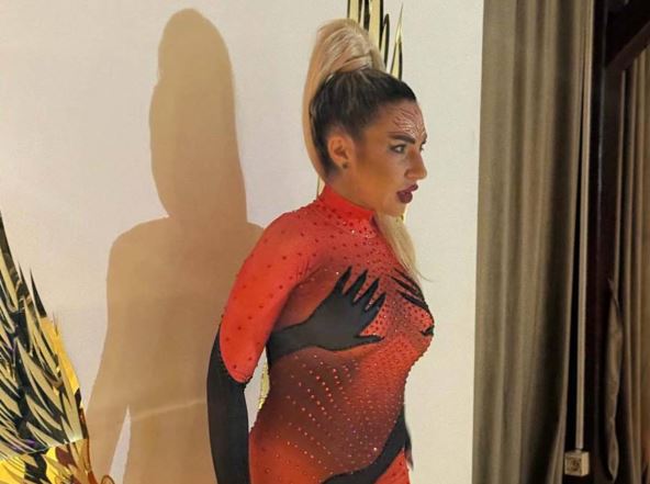 Voditeljka je potom i zaplesala pred medijima u svom prepoznatljivom stilu. Ona je bila obučena u crveni svetlucavi kombinezon sa dugačkim plaštom i crnim rukavicama.