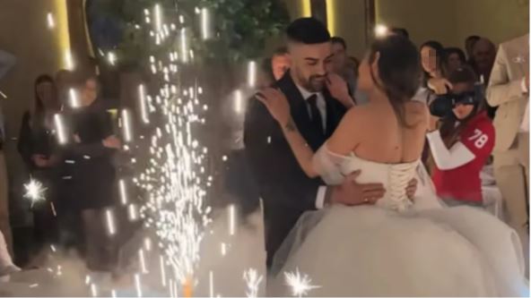 Mlada je blistala u prelepoj beloj venčanici dok je mladoženja nosio crno elegantno odelo. Njih je okruživao dim i vatromet, a mladenci su pucali od sreće. Sala je bila puna gostiju koji su oduševljeno snimali svaki trenutak. Njih dvoje su nedavno dobili i dete.