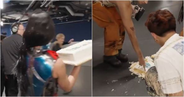 On se izmakao, a torta je završila na podu dok se Kejti smejala. Da zlo bude još gore, plesači su potom prišli i jeli tortu sa poda.