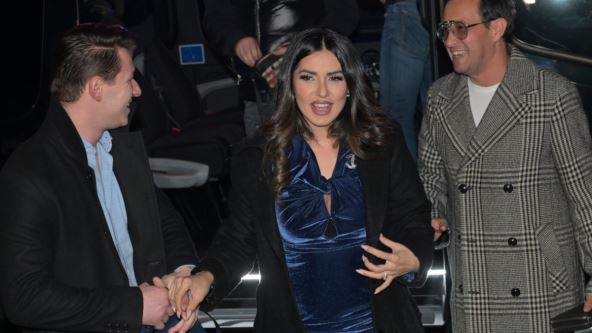 Malo pre ponoći, Tanja Savić je stigla u klub, sređena u elegantnoj teget haljini, a društvo joj je pravio verenik Muki, pa je pred kamerama okupljenih medija pao je i poljubac.