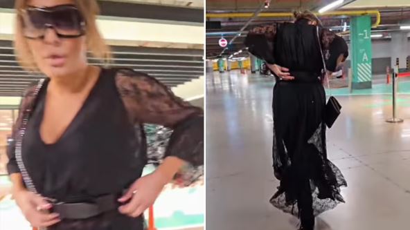 Na licu je imala crne sunčane naočare, a u jednom trenutku dok je pozirala i hodala "kao po pisti", ona se saplela te umalo da padne.