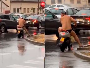 LUDILO U NOVOM SADU: Kiša lije, munje se prolamaju nebom, a pogledajte kako se ON spremio za vožnju skuterom (VIDEO)