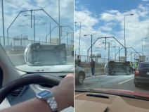 TEŠKA SAOBRAĆAJKA NA MOSTU NA ADI: Automobil se od siline udara okrenuo na bok (VIDEO)