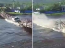 JEZIVO URUŠAVANJE DRVENOG MOSTA: Kamion pokušava da pređe preko njega, u sledećoj sekundi NESTAJE pod vodom (VIDEO)