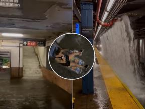 NEVEROVATNI PRIZORI POPLAVA U NJUJORKU: Ljudi ginu, metro pod vodom, a on se brčka na dušeku za plažu! (VIDEO)