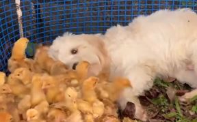 Pas se zaljubio u piliće i ne možemo da dođemo sebi od slatkoće: Ovaj video je sve što vam treba za lep dan